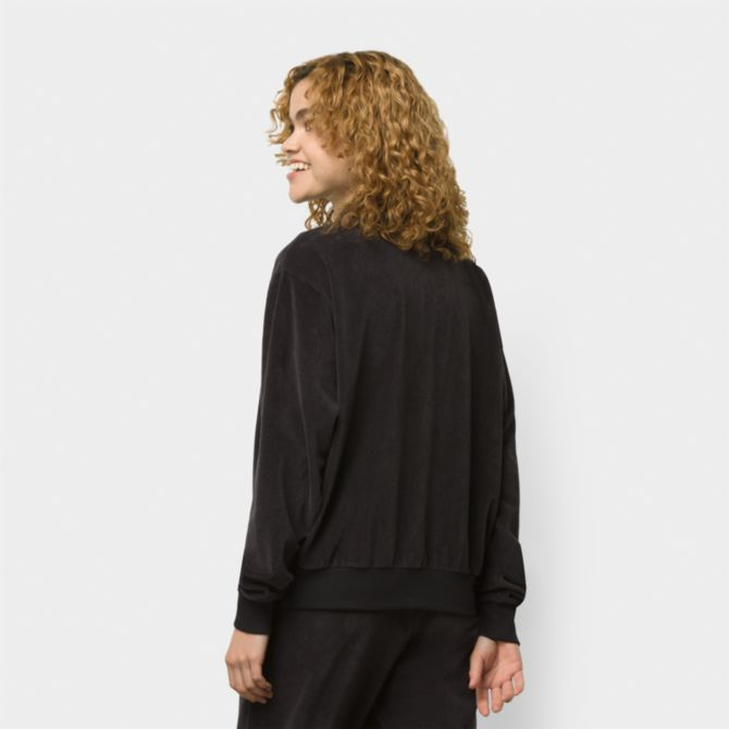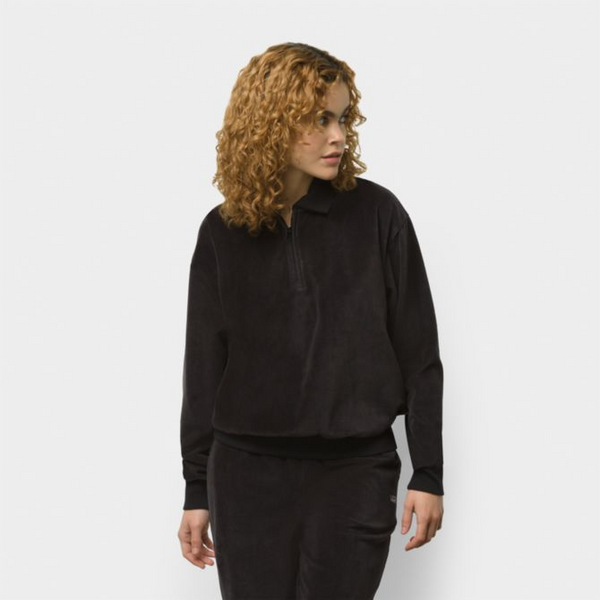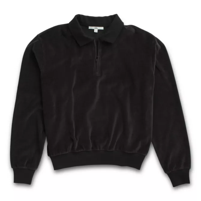 The Riley Polo is a 75% cotton, 20% polyester, and 5% elastane velour polo shirt with stretch ribbing, a quarter zip, and a boxy fit. Other unique details include dropped shoulders and ribbing at the collar, hem, and sleeve cuffs. Model is 5 feet 9 inches tall and wearing a size Small.