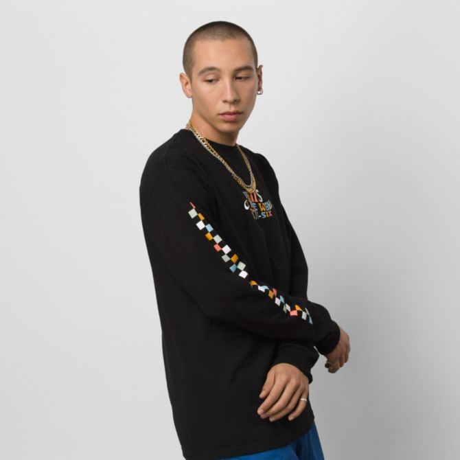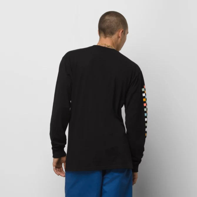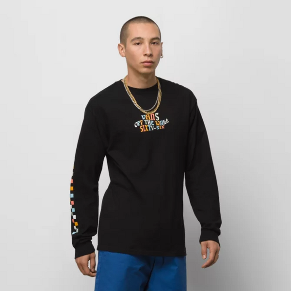 The Trippy Vans Long Sleeve T-Shirt features psychedelic front logo graphics in a retro rainbow color scheme. The addition of checkerboard graphics down the right sleeve add a classic heritage vibe to this heavier weight 100% carded ringspun cotton tee. Fit type: classic. Model is 6 feet tall and wearing a size Medium.