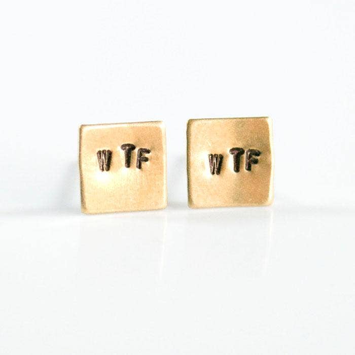Hand Stamped, square shaped, brass earrings that read "WTF". Because let's face it, there are so many people who make you want to SCREAM this sometimes…now you can wear the statement and smile to yourself…or point to your ears when THAT person is at it again.