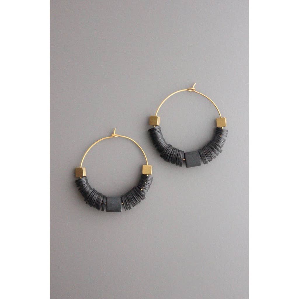 18k gold plated hoop earrings with vulcanite, black agate, and brass.